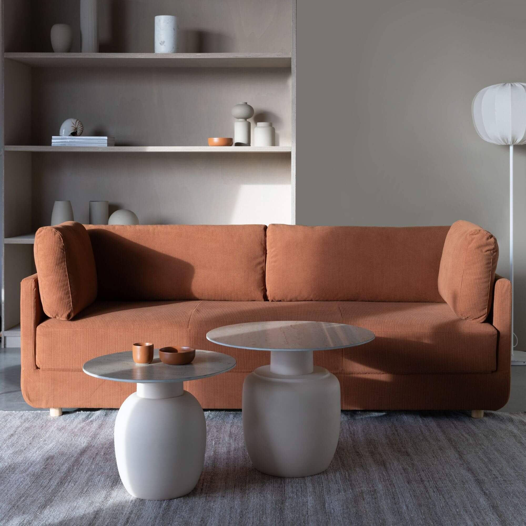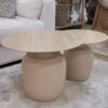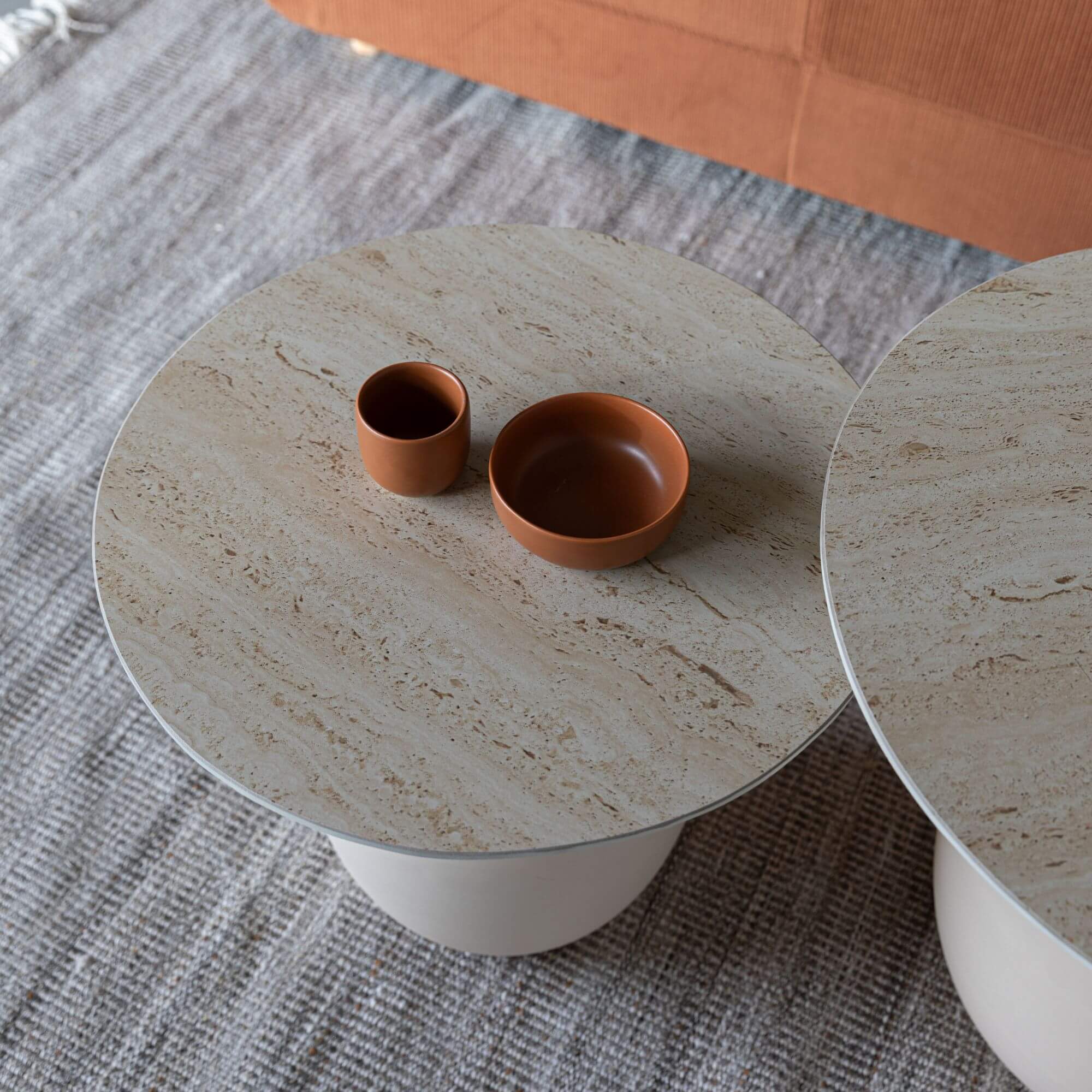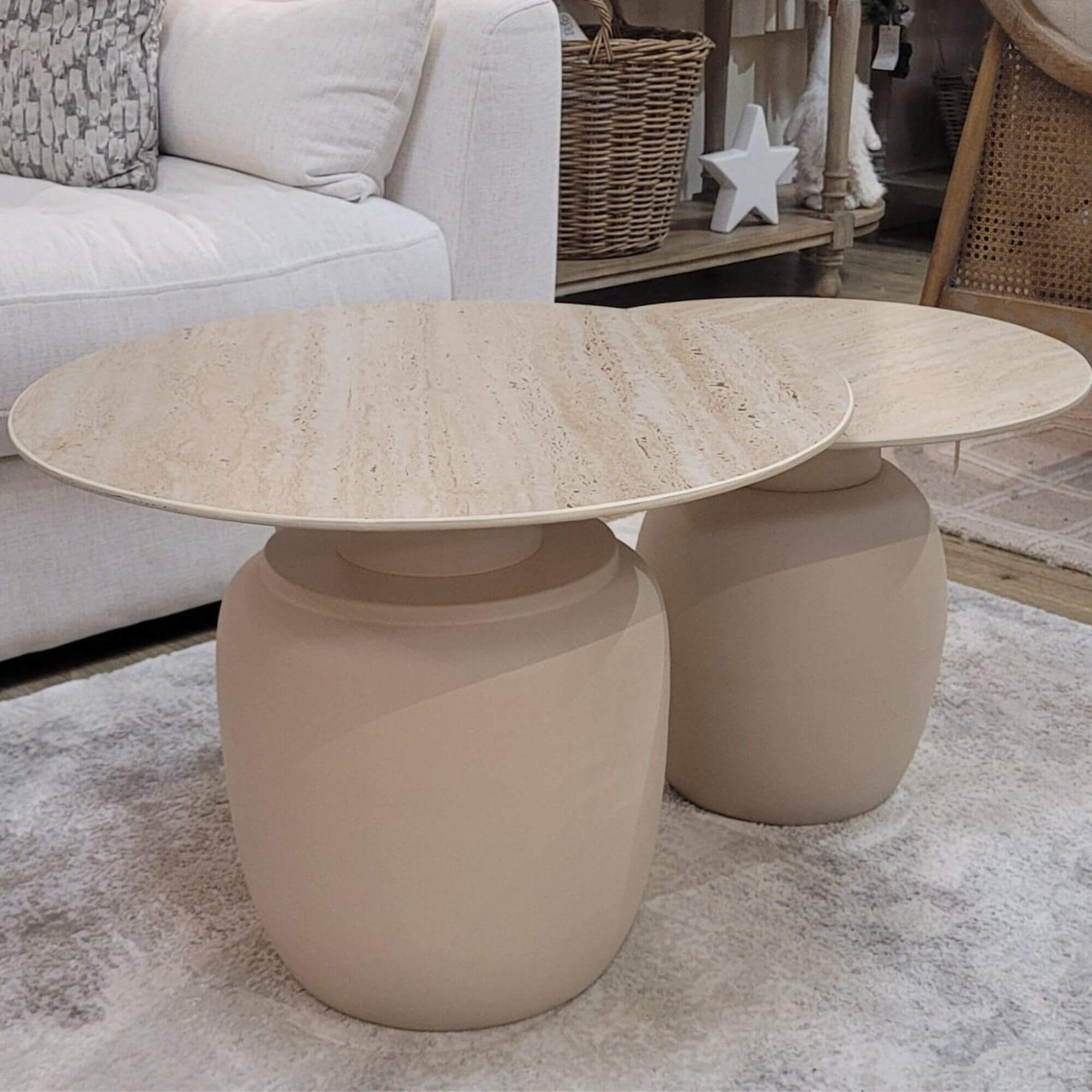 Karula est un mélange harmonieux d’éléments de design naturels. Son plateau en céramique arbore une magnifique apparence de travertin, s’harmonisant parfaitement avec la base en métal. La teinte ivoire apaisante et la forme ronde organique font de cette série un ajout parfait à votre espace de vie.