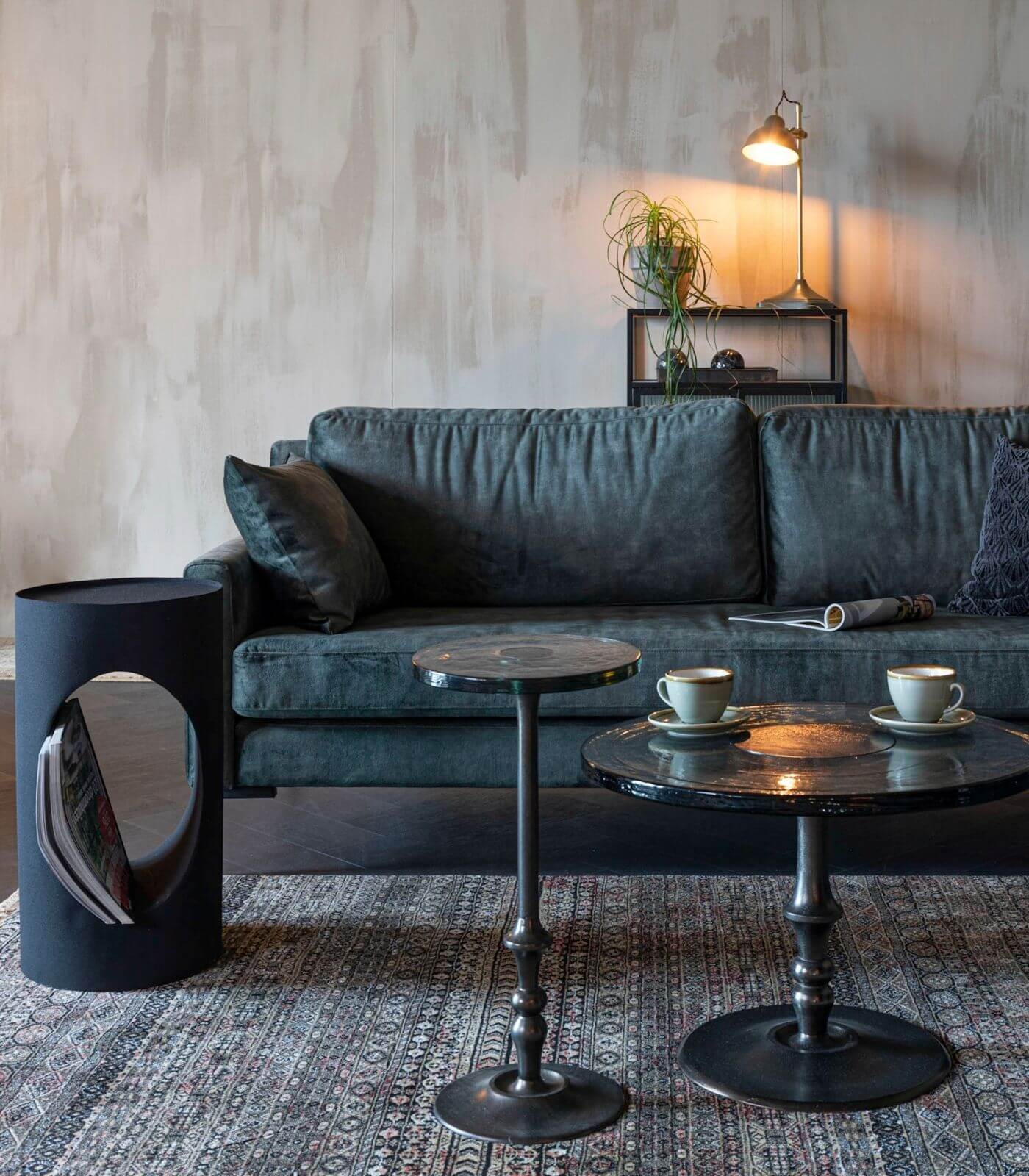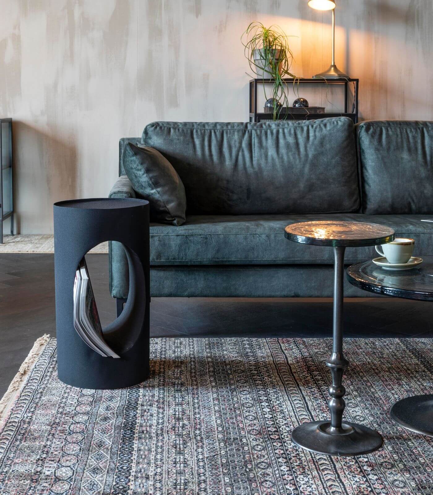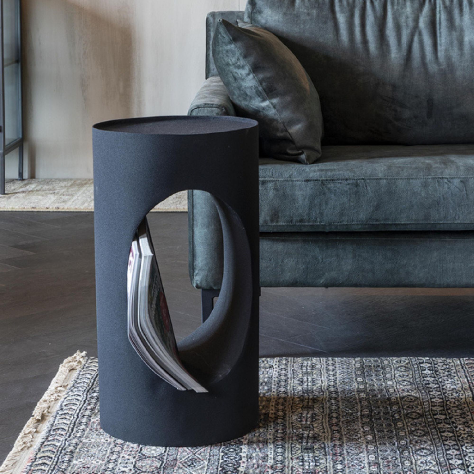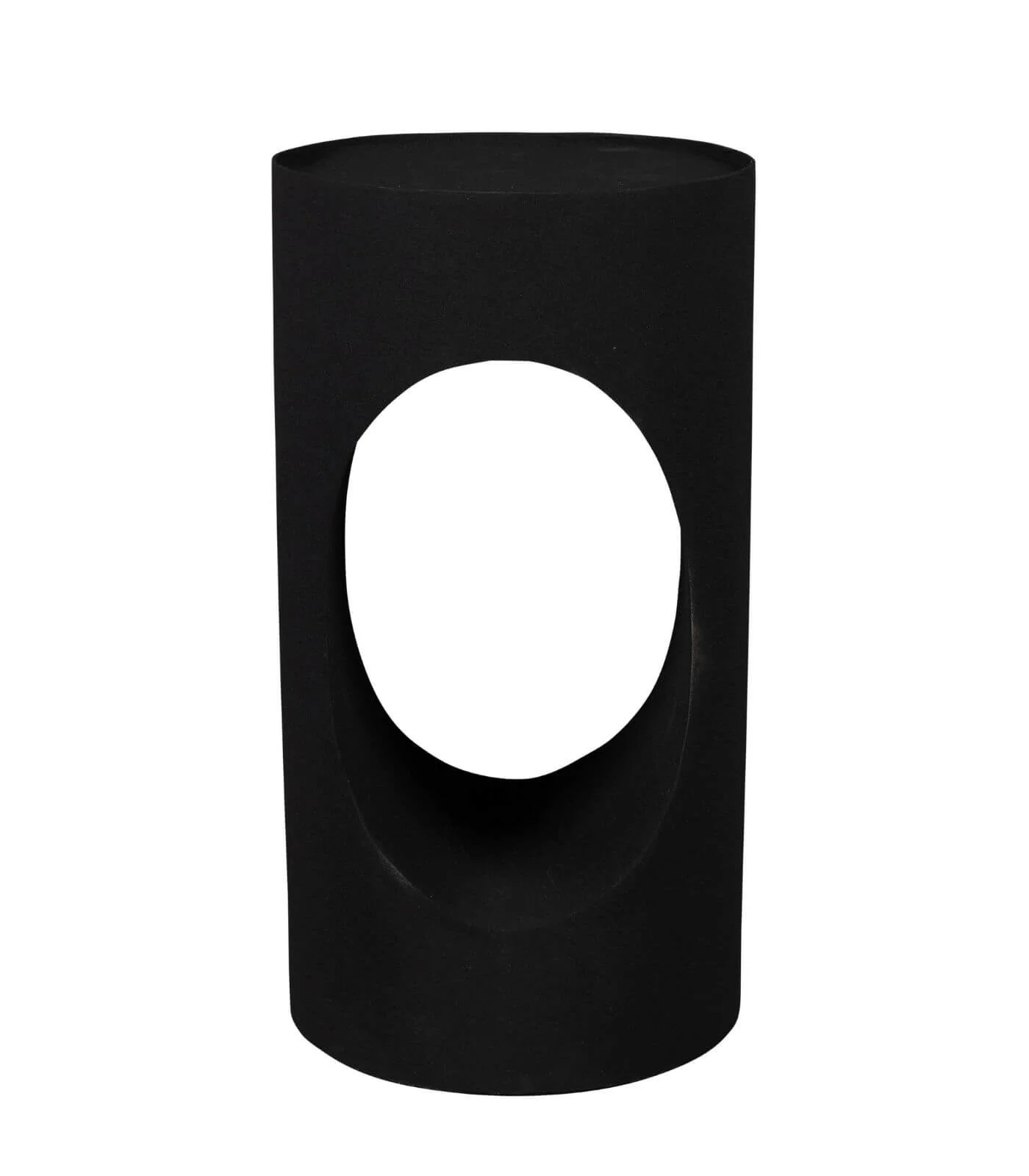 Entièrement fabriqué en métal de couleur noire, ce bout de canapé en forme de colonne ronde a la particularité d’être doté d’un trou au centre de sa structure.