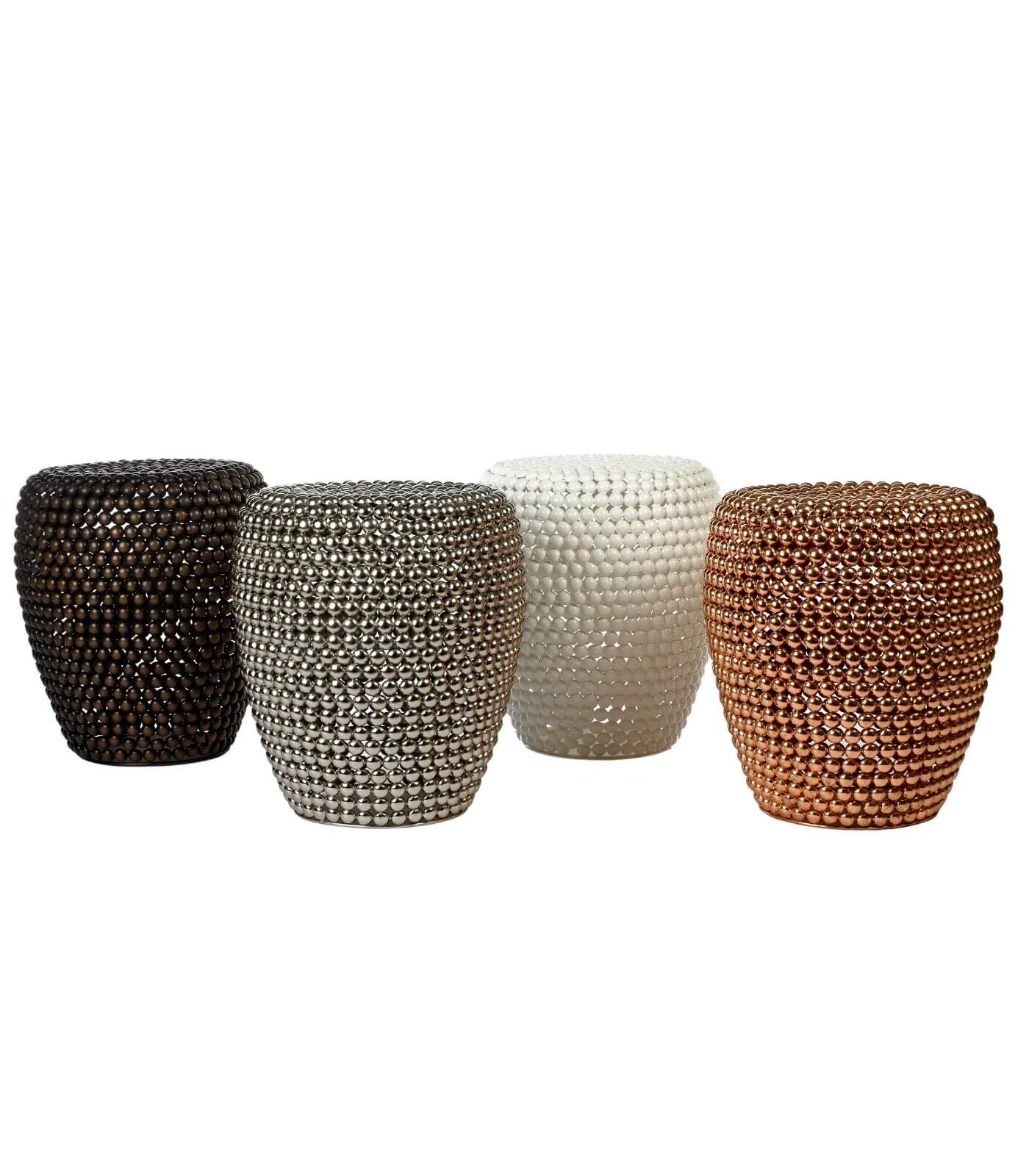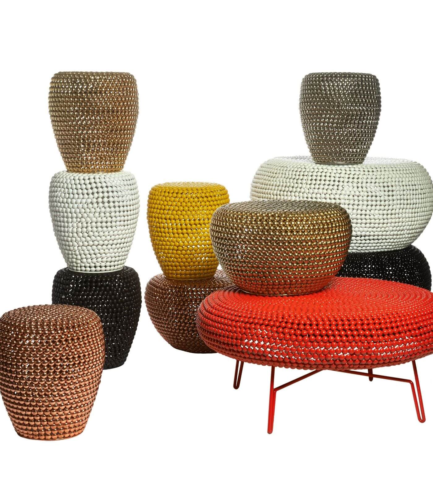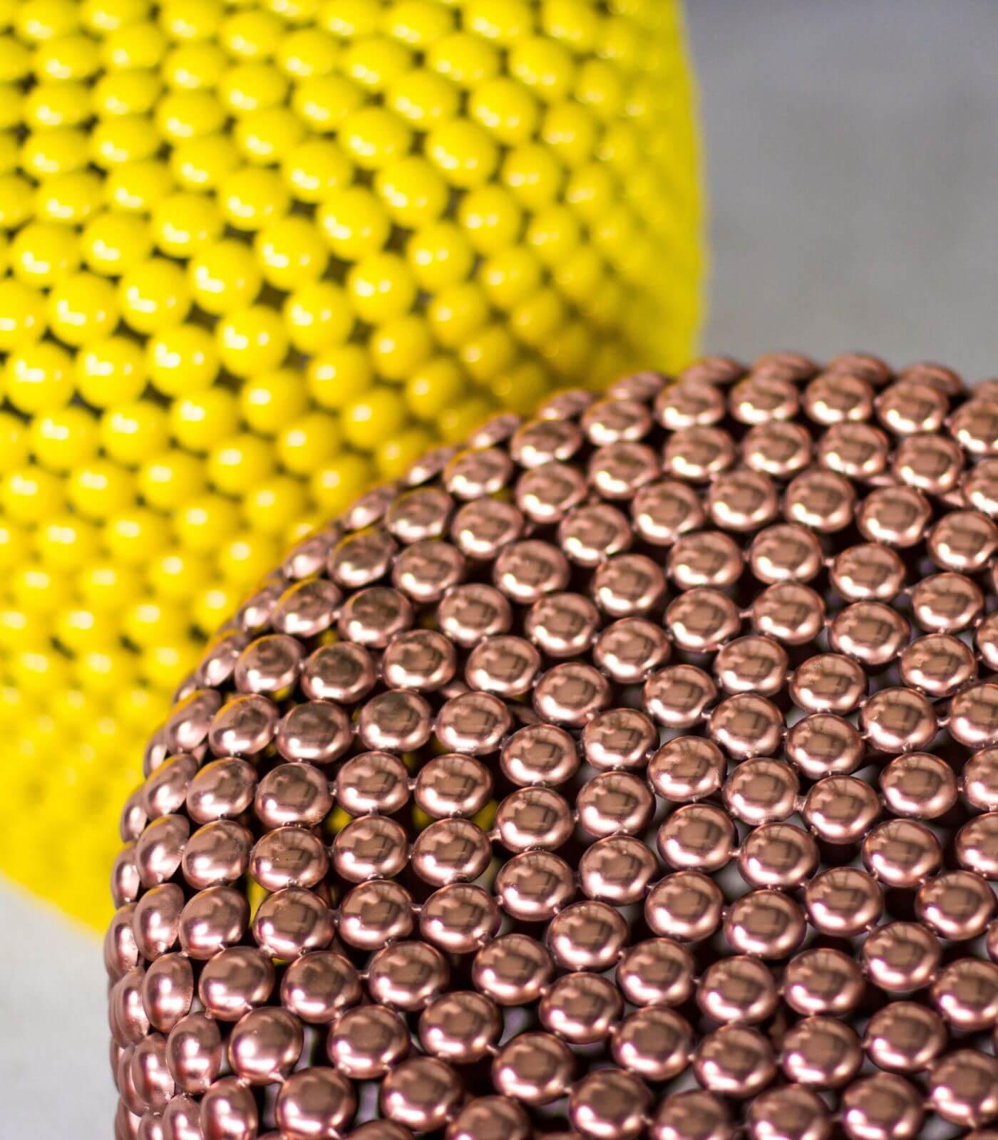Fabriqué artisanalement, ce tabouret/table d’appoint est issu d’un remarquable travail du métal. Il se compose d’une multitude de perles métalliques formant une structure subtilement ajourée qui joue avec les pleins et les vides. Tactile et sensuelle, sa surface appelle la caresse. Ce meuble précieux comme un bijou, capte la lumière et les regards !