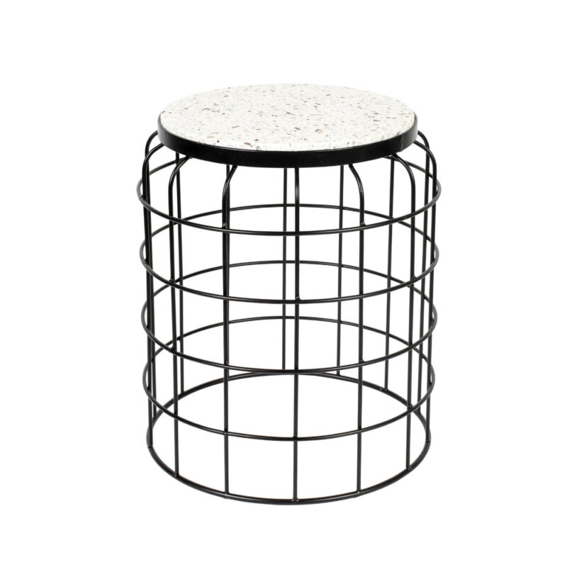 Le cadre est en métal et forme un quadrillage de 36 cm de diamètre. Un plateau en terrazzo de 30 cm vient se poser dessus. On allait oublier. Le terrazzo, qu’est ce que c’est ?