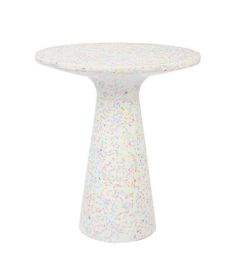 Aspect terrazzo, ce bout de canapé arbore un joli camaïeu moucheté aux nuances pastel dû à sa composition à partir de déchets plastiques résiduels collectés chez un fabricant de jouets.