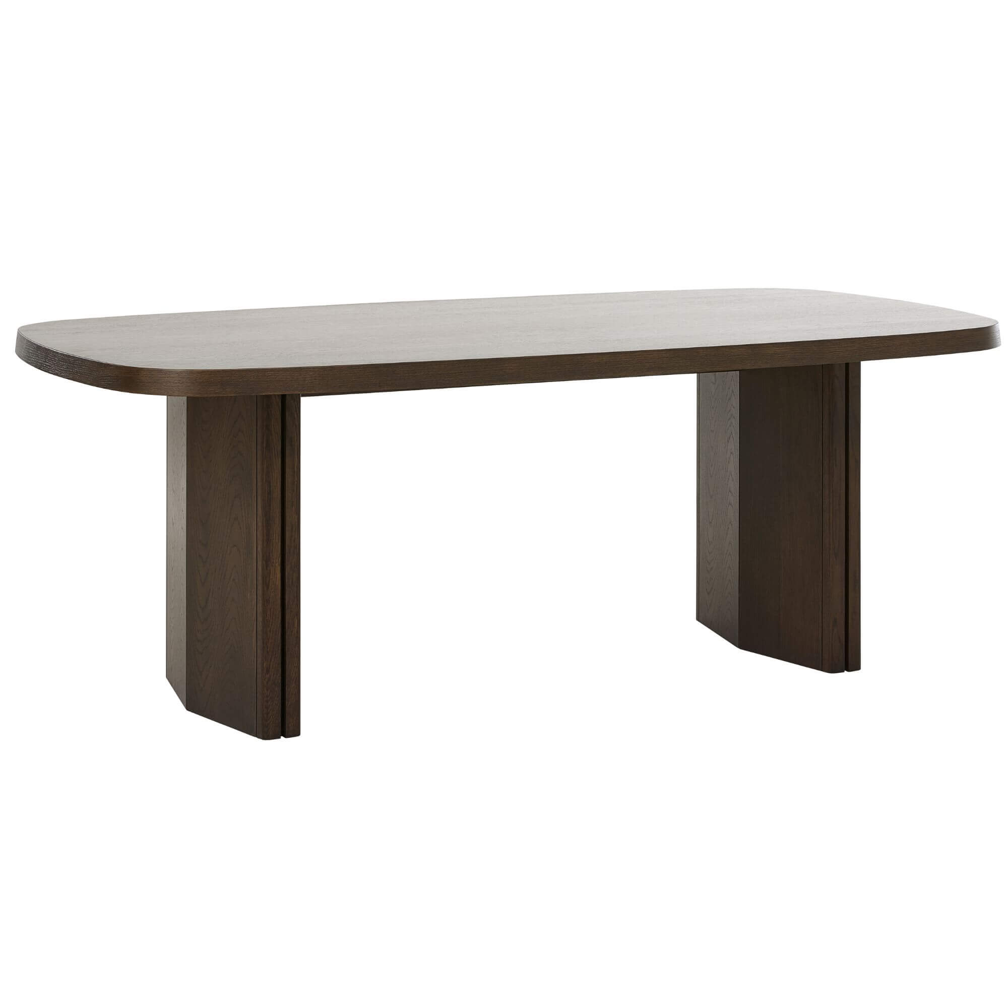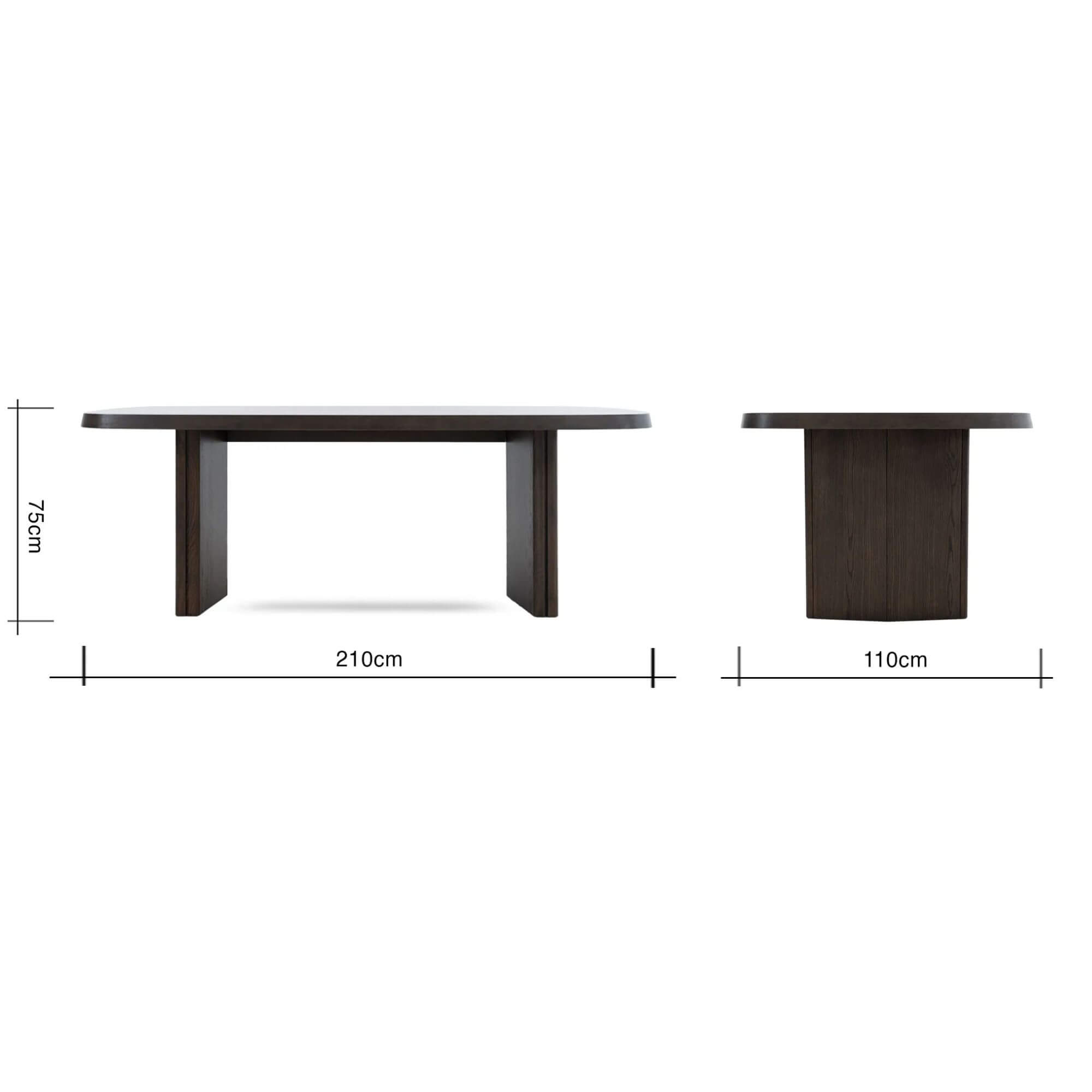 La table à manger Natu séduit par son design contemporain et ses lignes élégantes. Son plateau rectangulaire aux bords arrondis et ses pieds larges angulaires créent une silhouette architecturale à la fois moderne et intemporelle. Sa finition espresso en chêne apporte chaleur et sophistication à votre salle à manger. Dimensions : L210 × P110 × H75 cm.