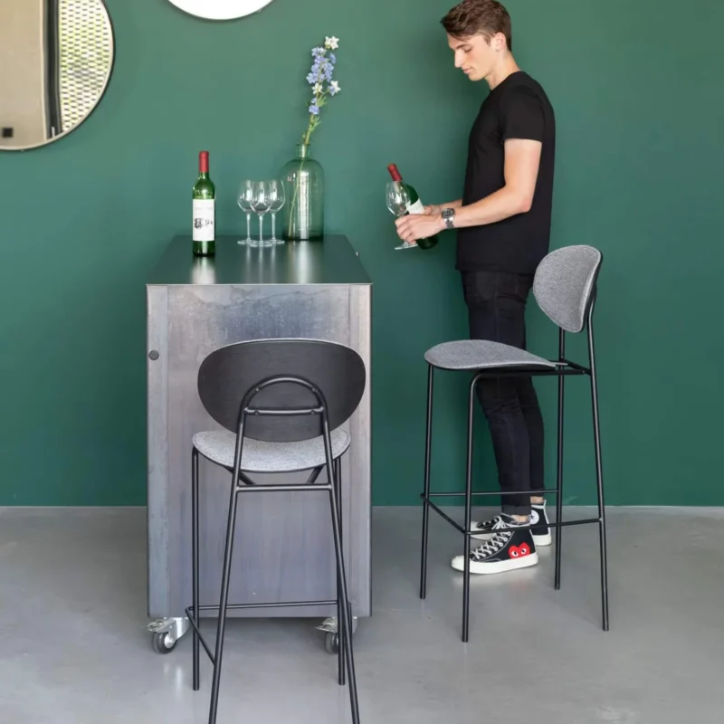 Le tabouret de bar Donny Grey allie confort et design pratique. Son assise et dossier sont habillés de tissu polyester rembourré d’une mousse d’une densité de 28 kg/m³, garantissant un confort optimal. La structure en acier est fine et légère, tout en offrant solidité et élégance. Équipé de patins en plastique pour une parfaite stabilité, ce tabouret supporte une charge maximale de 120 kg.