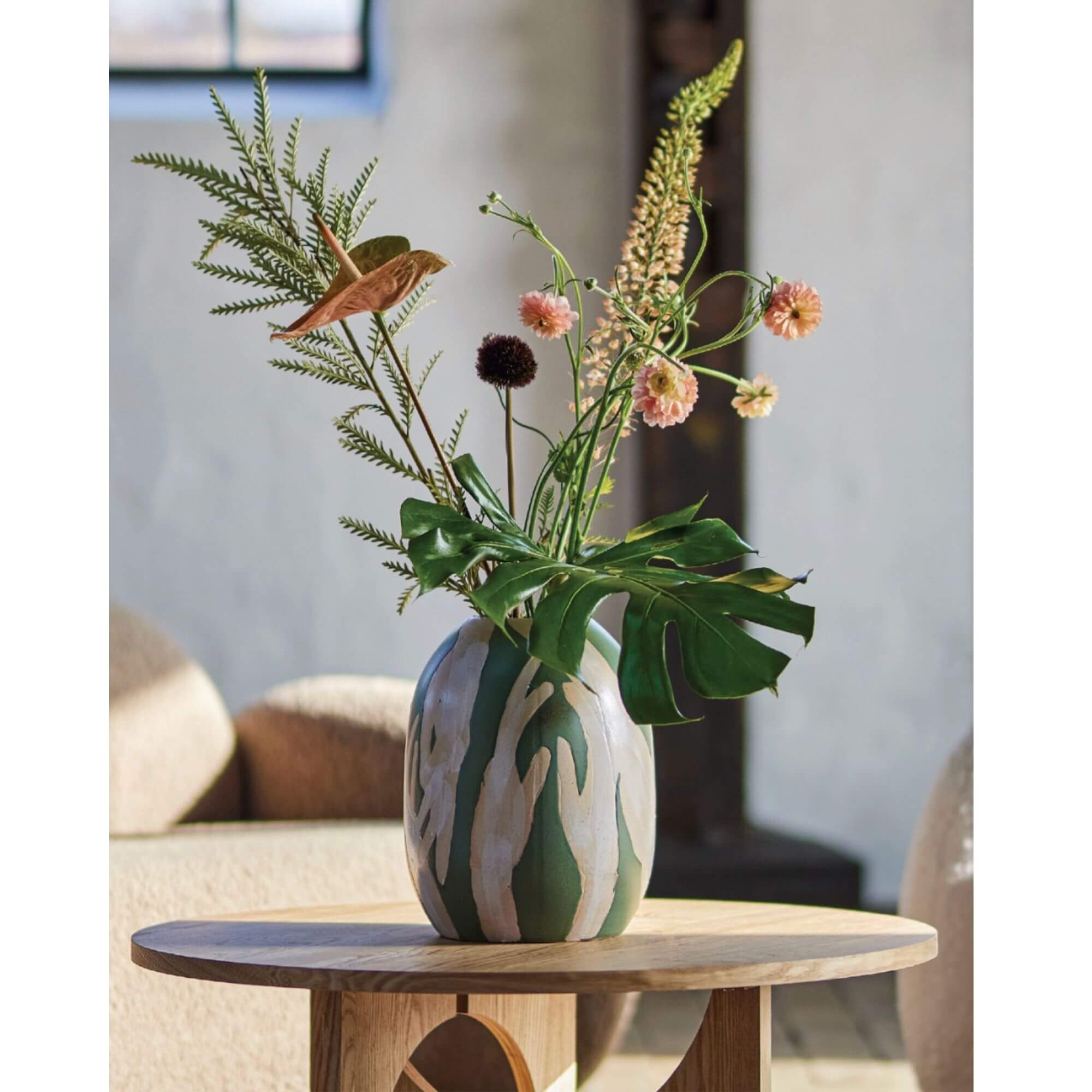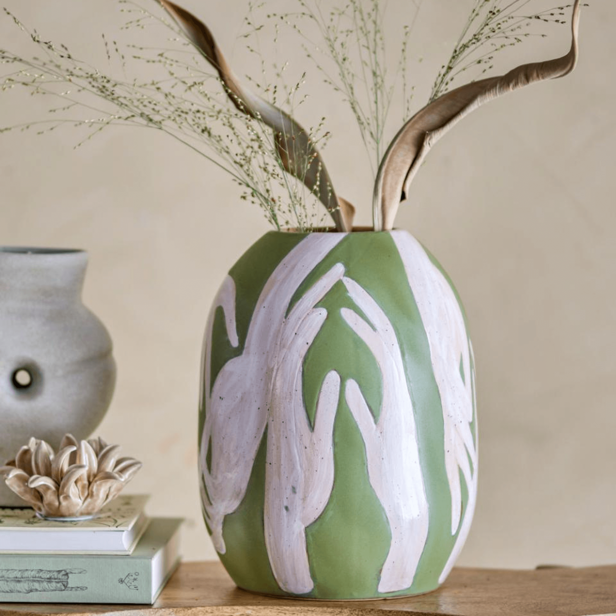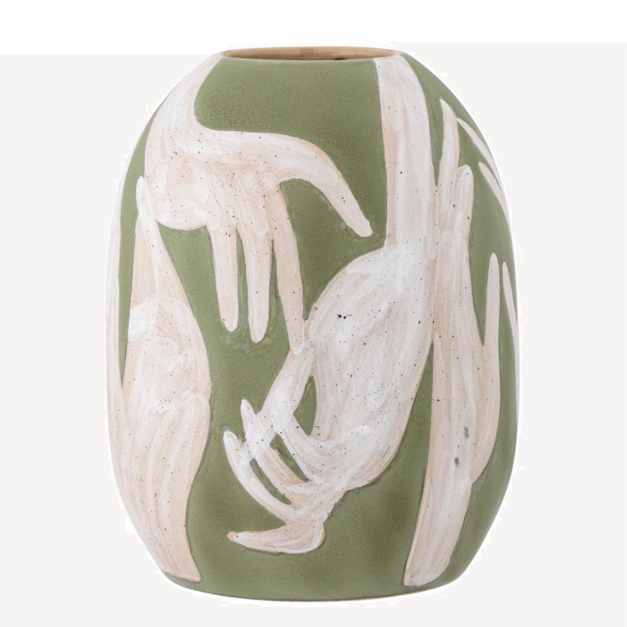 Le vase Adalena est une véritable petite œuvre d’art, impossible à ignorer avec son vert frais et son motif de mains dansantes peint à la main. Il fait sensation en simple pièce décorative… mais il adore aussi accueillir quelques fleurs pour compléter son numéro. Un vase qui sait mettre l’ambiance, même sans bouquet !