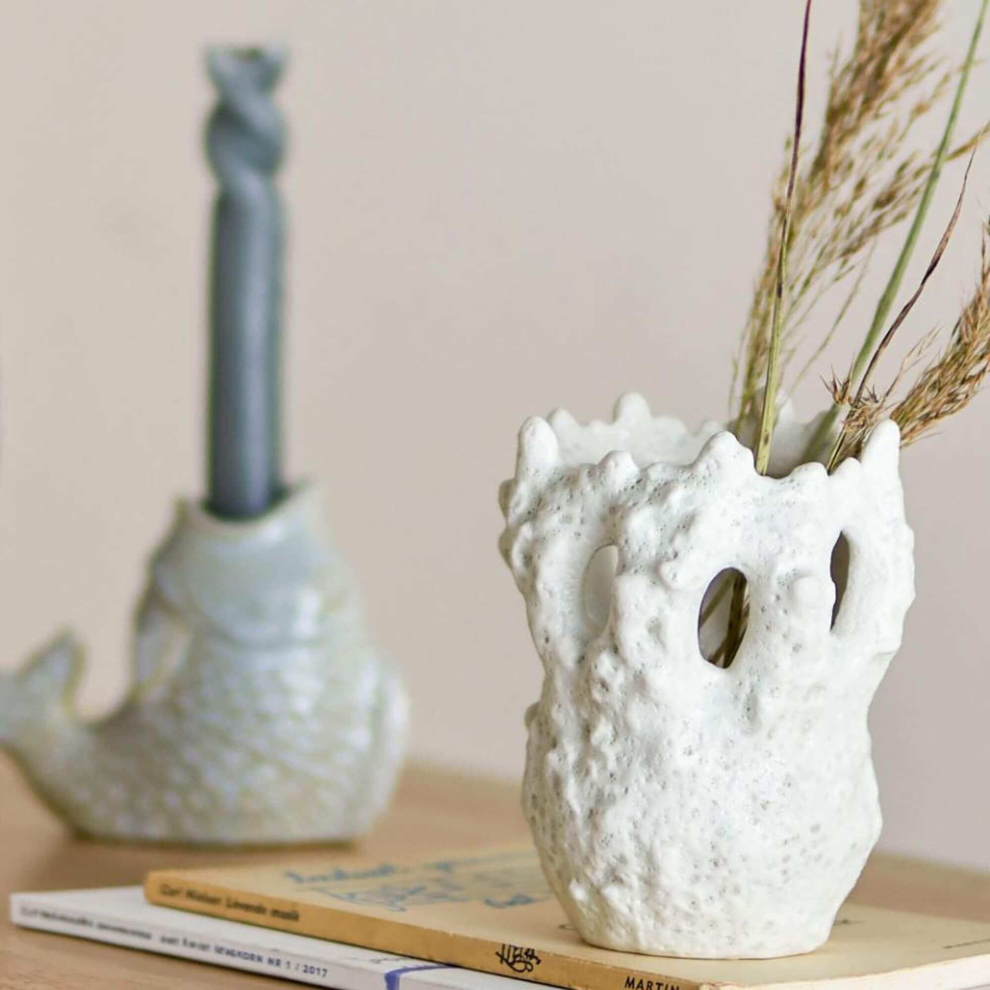 Le vase Fianna est un vase en grès inspiré des formes sculpturales et des textures étonnantes de la mer. Avec sa surface ondulée et son design organique, il évoque aussi bien un fragment de récif corallien qu’un caillou mystérieux tout droit remonté des abysses — sans plongeur requis.