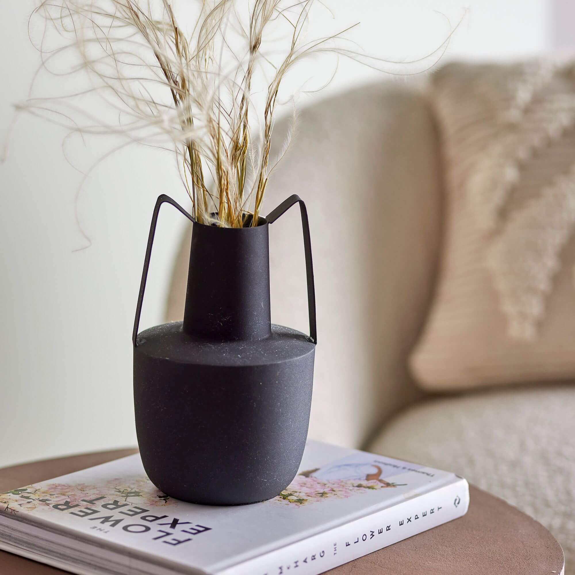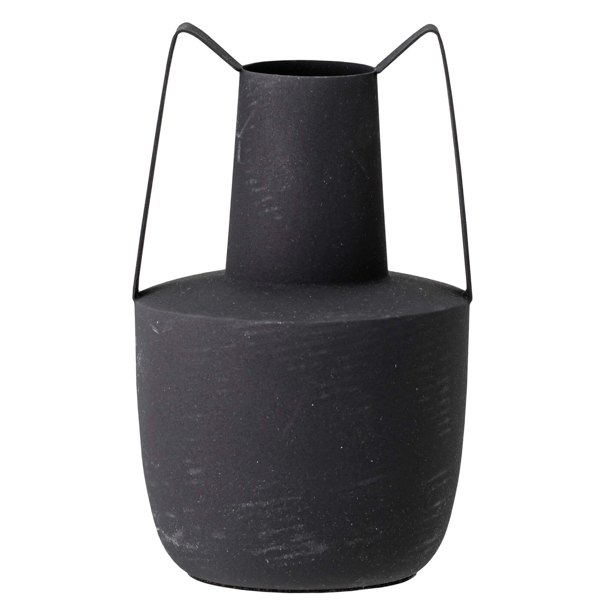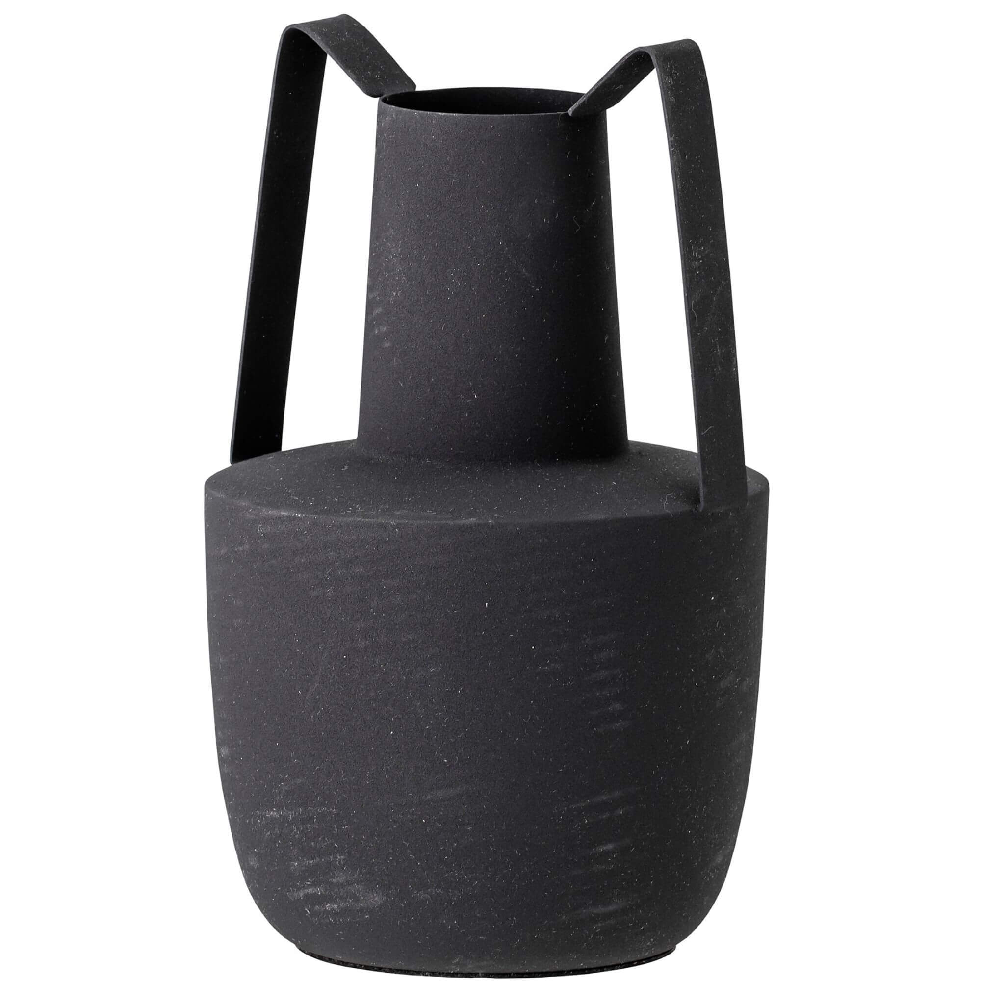 Vase moderne en métal noir avec finition rugueuse. Placez-le seul ou avec d’autres accessoires d’intérieur.
