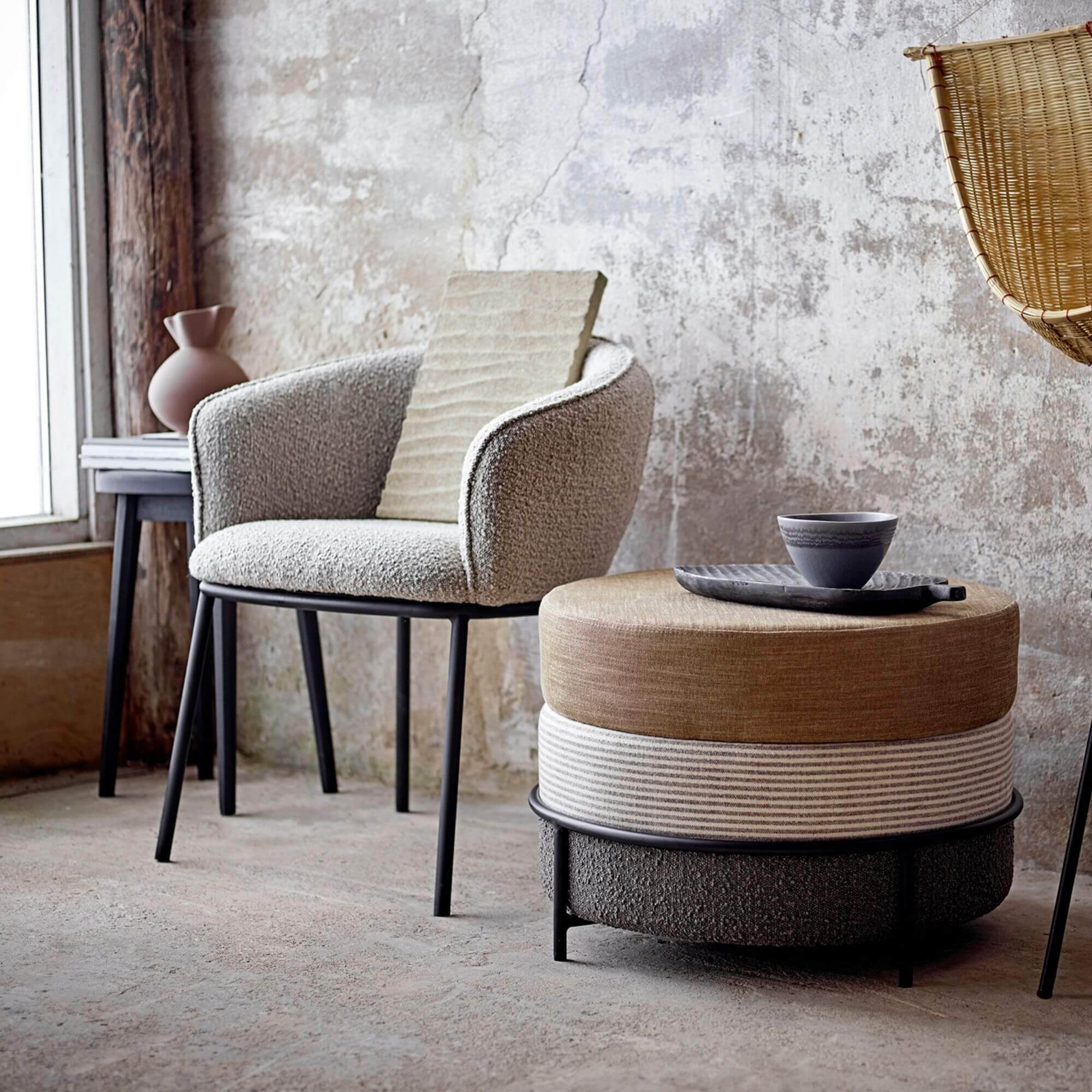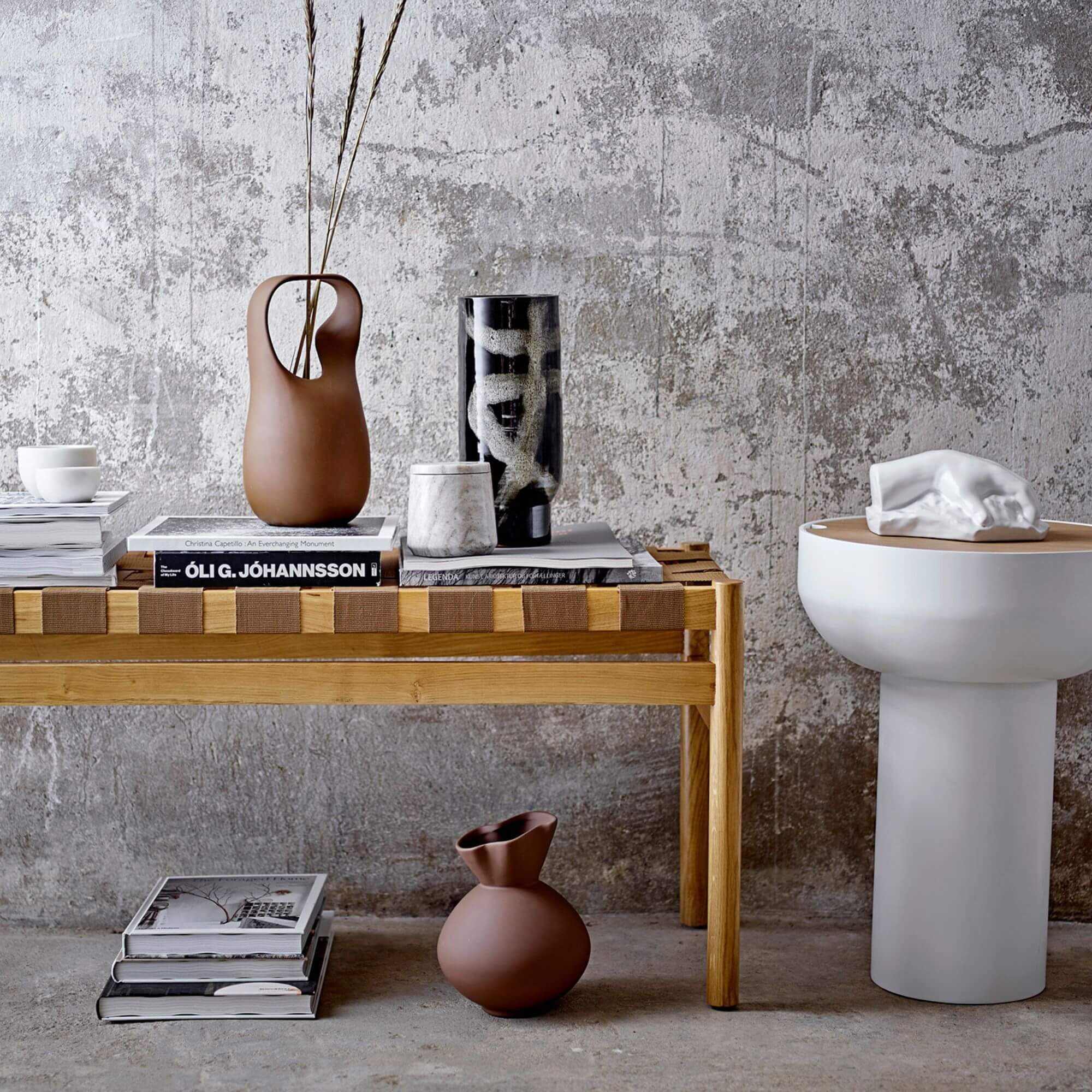 Ce vase pourrait à première vue ressembler à un vieux sac en toile fermé par une petite ficelle. Il est en grès avec un glacis au latex mat et une finition en silicone qui lui donne une esthétique différente et intéressante. La forme conique et ondulée de ce vase permet de bien répartir les différentes plantes et fleurs pour créer un magnifique bouquet.