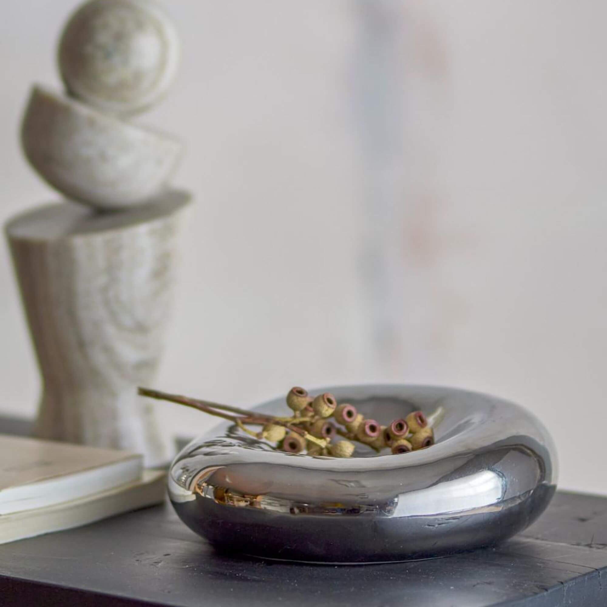 Le vide-poche Shine est une pièce décorative en céramique, sublimée par une glaçure chromée qui lui confère un aspect brillant et résolument moderne. Véritable élément de caractère, il est parfait pour apporter une touche design à votre intérieur. Disposez-le sur une table de salle à manger, une étagère ou dans une bibliothèque, et profitez chaque jour de son éclat raffiné.